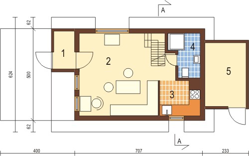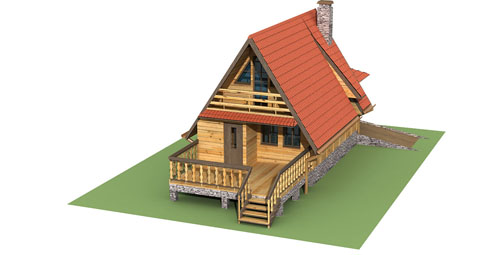 Program: pokój, salon, antresola, kuchnia oraz komórka gospodarcza.